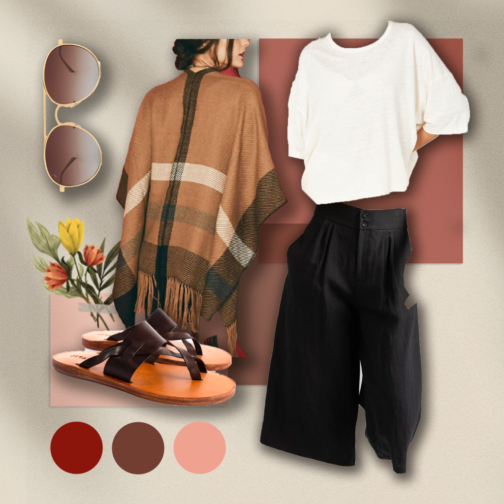 Today’s Restyle is all about bohemian chic. We’ve put together Outland Denim’s Slouchy Linen Tee with Untouched Worlds Alani Crop Pant and paired them with a shawl called the Laure Ruana from a lovely brand called Philomena available at Powered By People. The whole look has been complimented with sandals called the Women’s Ishori from Jivanas and finished with sunglasses from Find Your Birds called the Apollo Aviator in gold. At Restylist this is the go to style for when we feel we need a me day, relaxing in a lovely cafe, somewhere in the countryside, with a good book. It’s the perfect style to browse away in a garden centre or just take a casual walk in a park on a warm Autumn day.