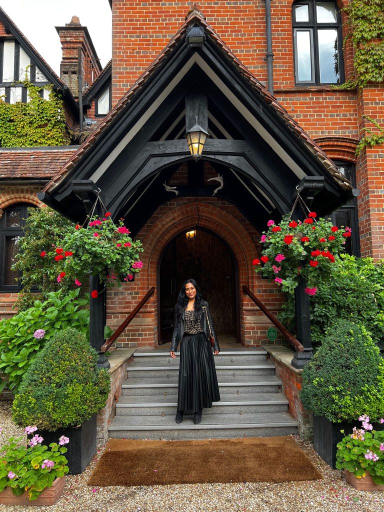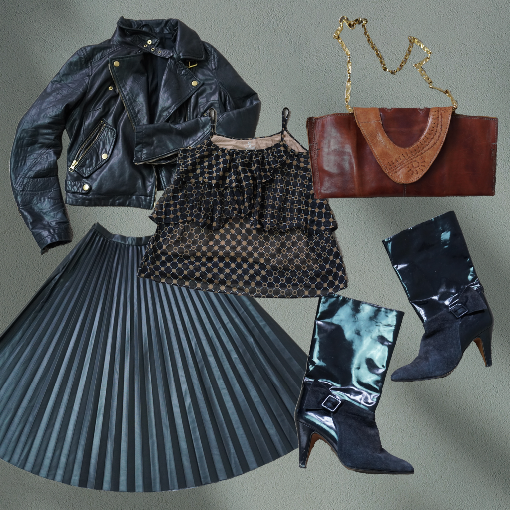 For this enchanting ensemble, I’ve opted for a black faux-leather pleated skirt that is one size too big, a hidden gem I discovered at a pop-up charity shop in Petersfield for only £6. The one size too big gives a flowy silhouette and rich texture which makes it a statement piece, perfect for creating an eye-catching look.